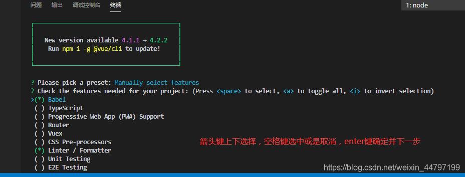 //手动配置(按方向键 ↓)是我们所需要的面向生产的项目,提供可选功能的 npm 包