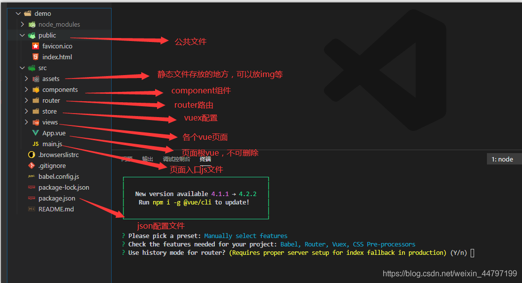 下面是各个功能配置的中文翻译,我们一般选择 Babel,Router,Vuex,Css