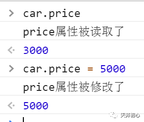 通过Object.defineProperty()方法给car定义了一个price属性,并把这个属性的读和写分别使用get()和set()进行拦截,每当该属性进行读或写操作的时候就会触发get()和set()。如下图: