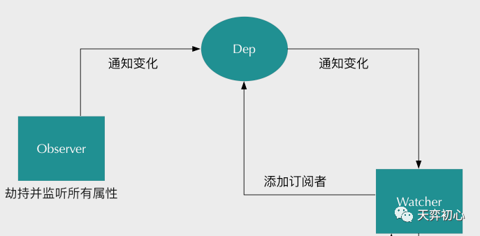 我们将订阅器Dep添加订阅者的操作设计在getter里面,这是为了让Watcher初始化时进行触发,因此需要判断是否要添加订阅者。在setter函数里面,如果数据变化,就会去通知所有订阅者,订阅者们就会去执行对应的更新的函数。