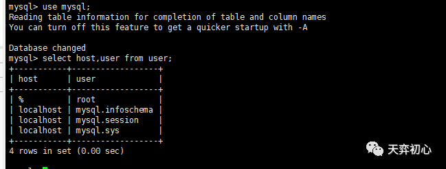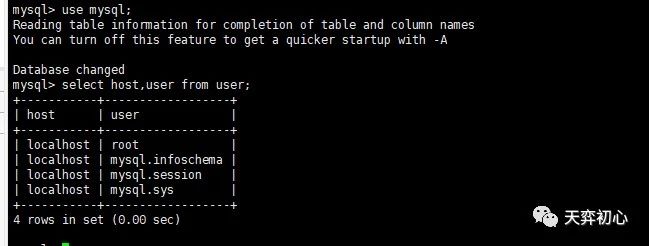 # select host from user where user='root'; //本命令为查看单独的root,若执行了上面的select host,user from user;,这个可以省略
