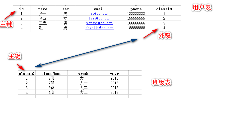 3.创建数据表 user表(id,name,age,sex,email,phone,classId) class表(id,name,year,grade)