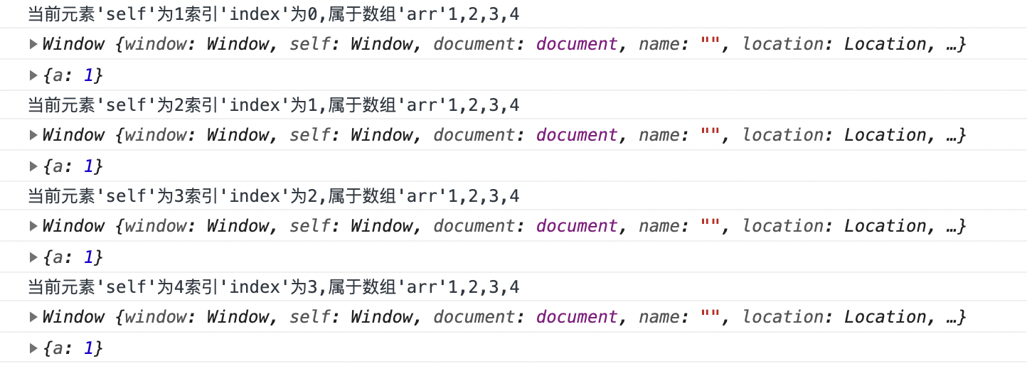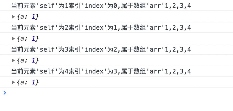 console.log(`当前元素'self'为${self}索引'index'为${index},属于数组'arr'${arr}`);