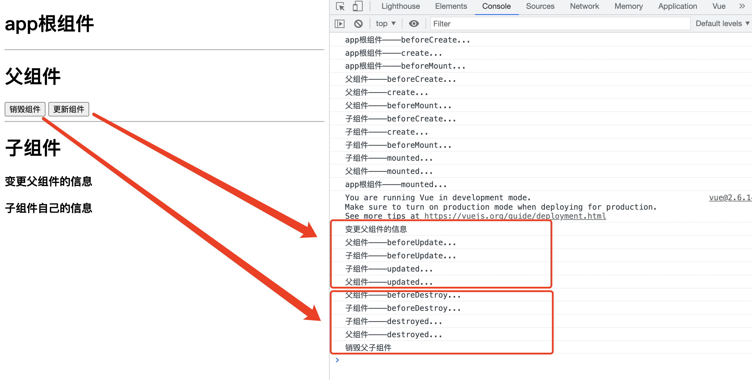 父beforeCreate -> 父created -> 父beforeMount -> 子beforeCreate -> 子created -> 子beforeMount -> 子mounted -> 父mounted->父beforeUpdate->子beforeUpdate->子updated->父updated->父beforeDestroy->子beforeDestroy->子destroyed->父destroyed