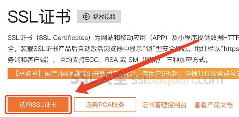 1、打开阿里云SSL证书页面,点击“选购SSL证书”