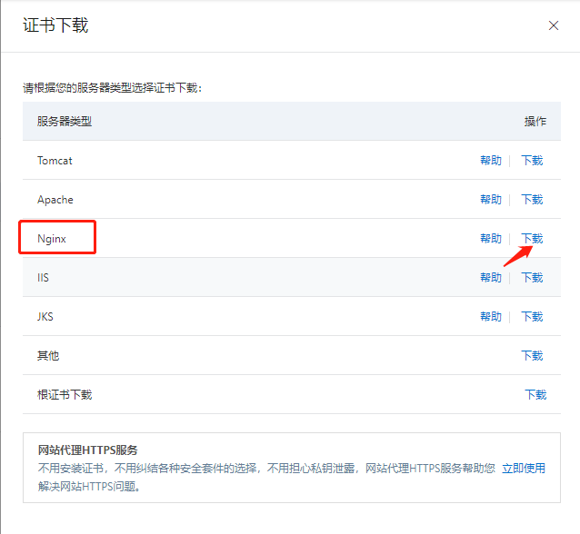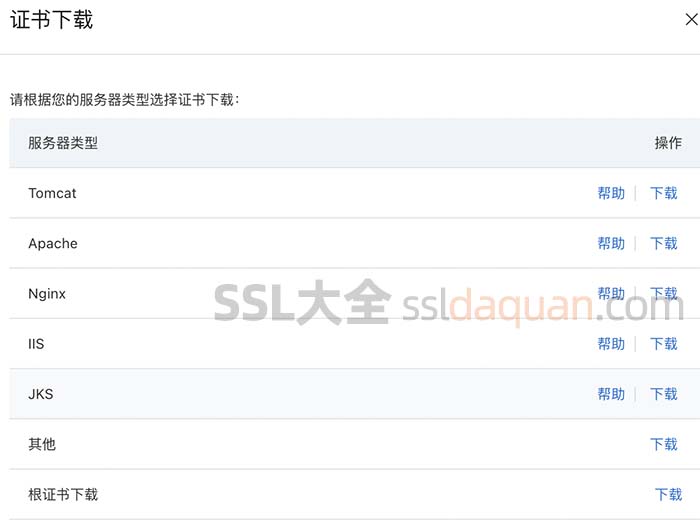 一般等待几分钟即可下发SSL证书,然后下载证书即可。阿里云SSL证书支持多种服务器类型,如:Tomcat、Apache、Nginx、IIS、JKS、其他及根证书下载。如下图:
