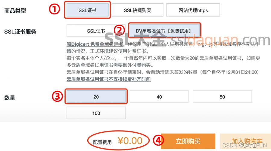 - SSL证书服务:DV单域名证书【免费试用】