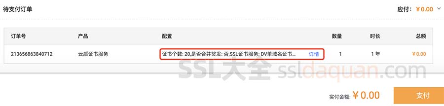支付成功后,即购买了免费SSL证书资源包,这个资源包可以申请20个免费SSL证书,后续需要在SSL管理控制台申请使用。