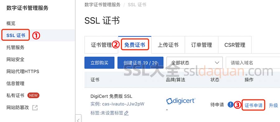 2022阿里云免费SSL证书品牌为DigiCert DV单域名证书,每个阿里云账号可以申请20个免费SSL证书资源包,SSL证书大全图文详解阿里云SSL证书免费申请和部署教程,包括SSL证书申请域名DNS验证等操作。