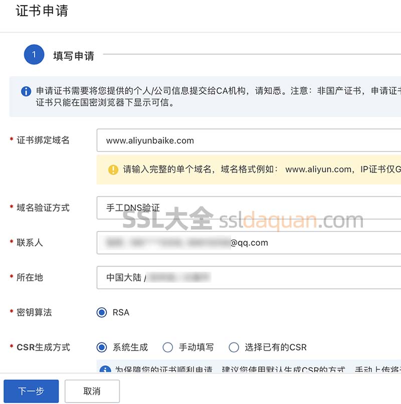 阿里云SSL证书申请信息填写