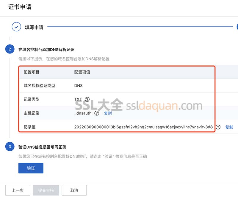 回到刚刚的SSL证书申请页面,点击“验证”,如果域名验证成功,点击“提交审核”即可,如下图: