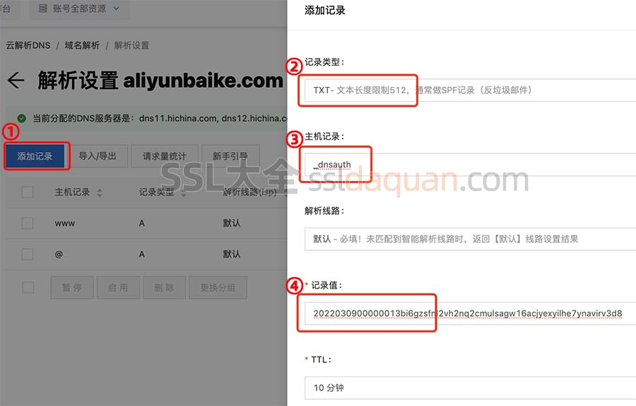 按照上图中SSL证书验证提示,登录到域名管理控制台,为域名添加TXT记录,主机记录为_dnsauth,复制记录值。SSL大全以阿里云域名解析为例,演示一下申请SSL证书域名添加DNS验证方法,登录到阿里云域名DNS解析控制台,按照下图添加: