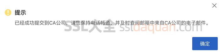 提交审核后会提示:已经成功提交到CA公司,请您保持电话畅通,并及时查阅邮箱中来自CA公司的电子邮件。如下图:
