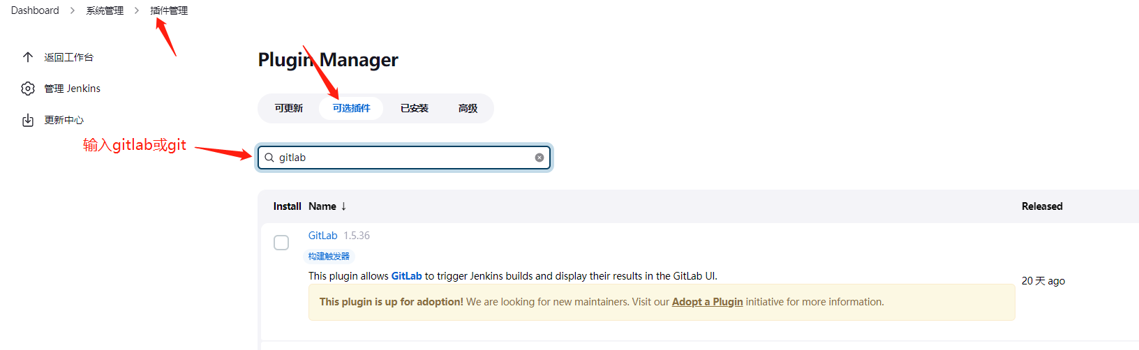 点击系统管理,再点击管理插件,切换到可选插件,分别搜索GitLab Plugin和Git Plugin,然后点击直接安装: