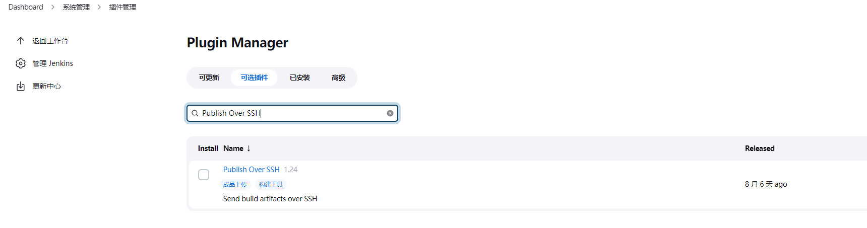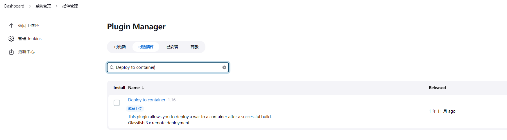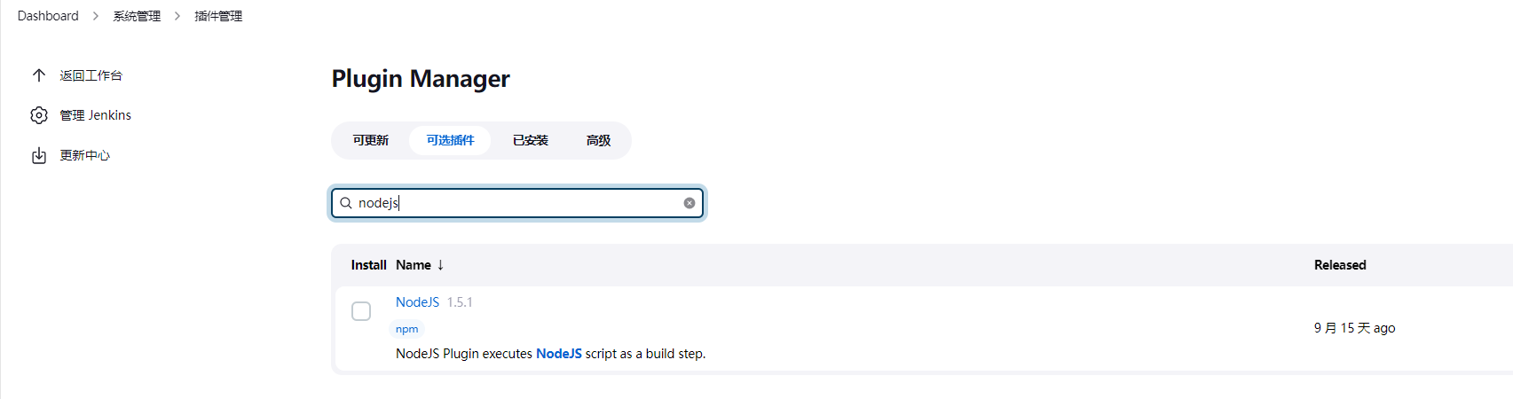 点击系统管理,再点击管理插件,切换到可选插件,分别搜索NodeJS、Deploy to container和Publish Over SSH,然后点击直接安装: