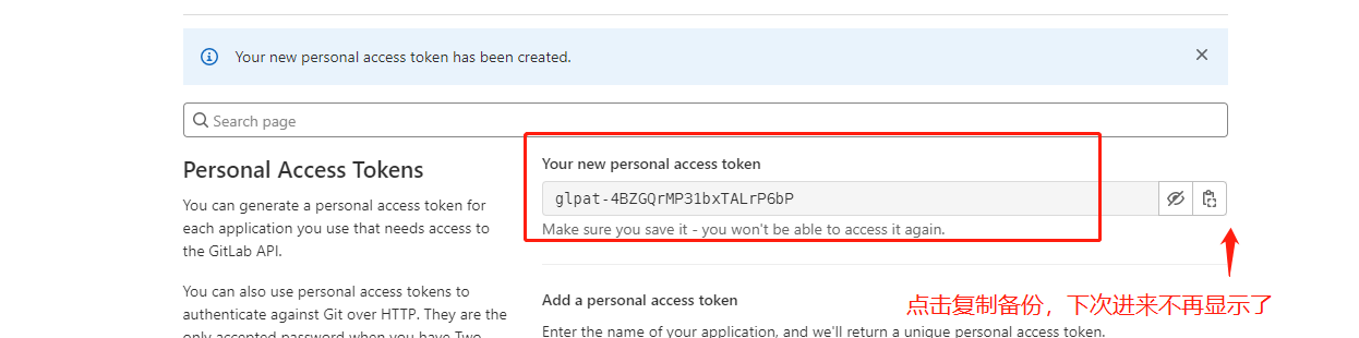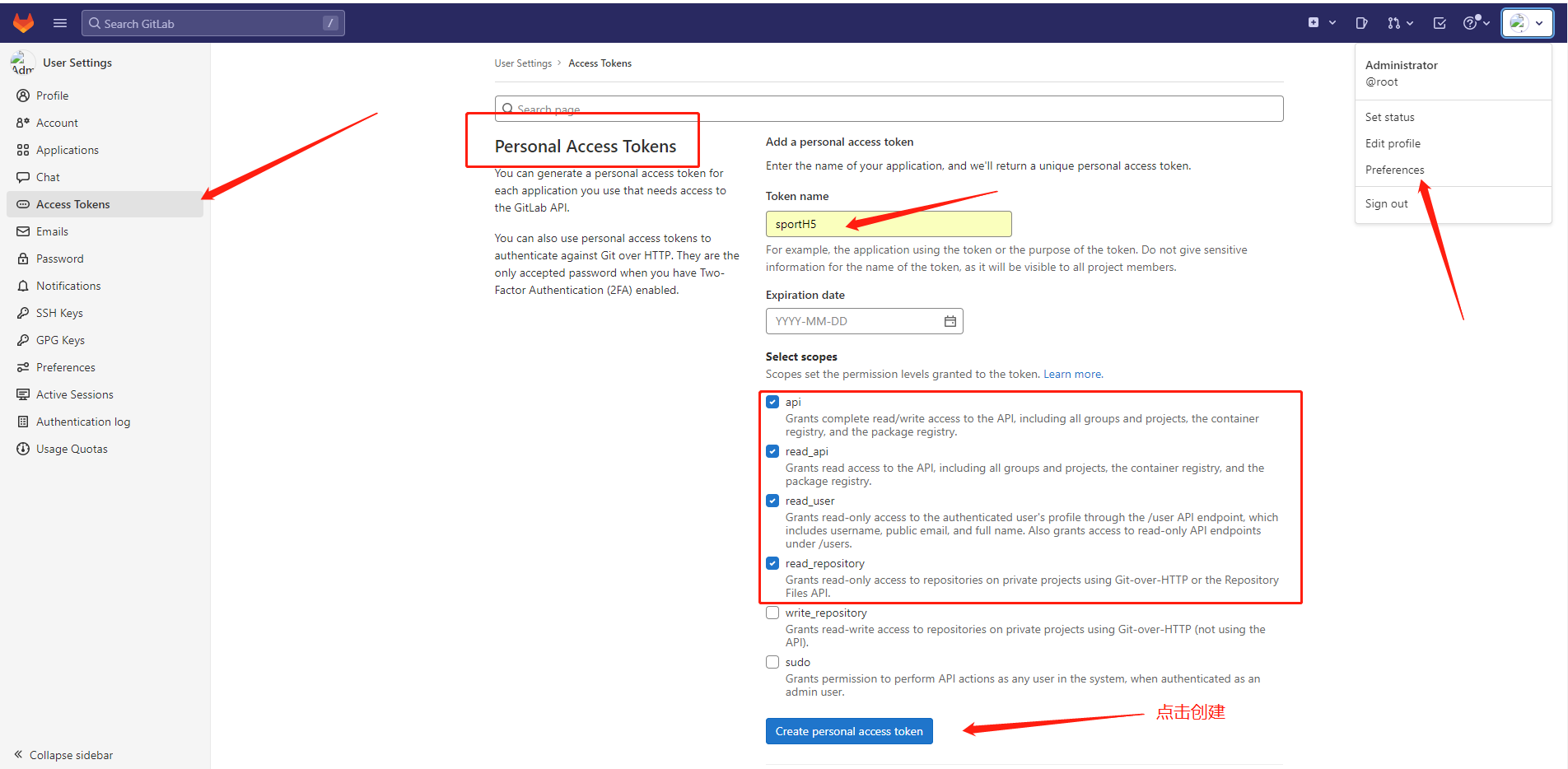 打开GitLab(例如公司内网的GitLab网站),点击个人设置菜单下的preferences,再点击左侧菜单下的Access Tokens,创建Personal Access Tokens后,复制备用: