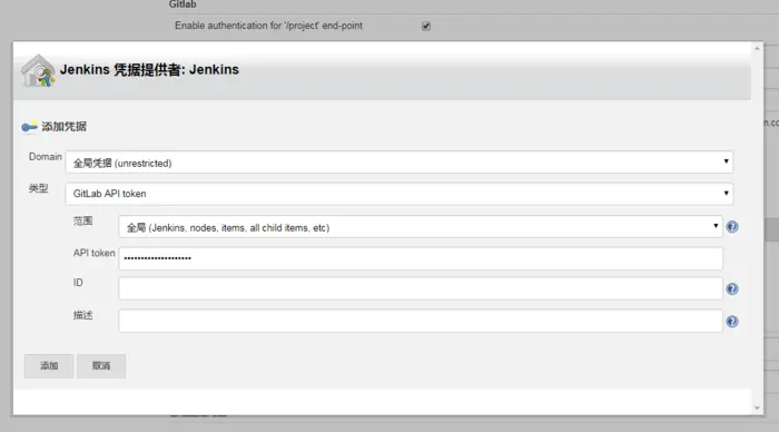 点击Add下拉框,点击jenkins;弹出框里,kind选择GitLab API Token,将之前复制备用的Personal Access Tokens粘贴到API token输入框中,然后点击添加:
