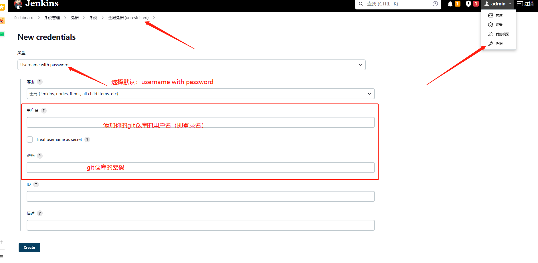 点击右上角admin,再点击凭据,点击最下面的system,点击全局凭据,点击右上角的add credentials添加新的凭据: